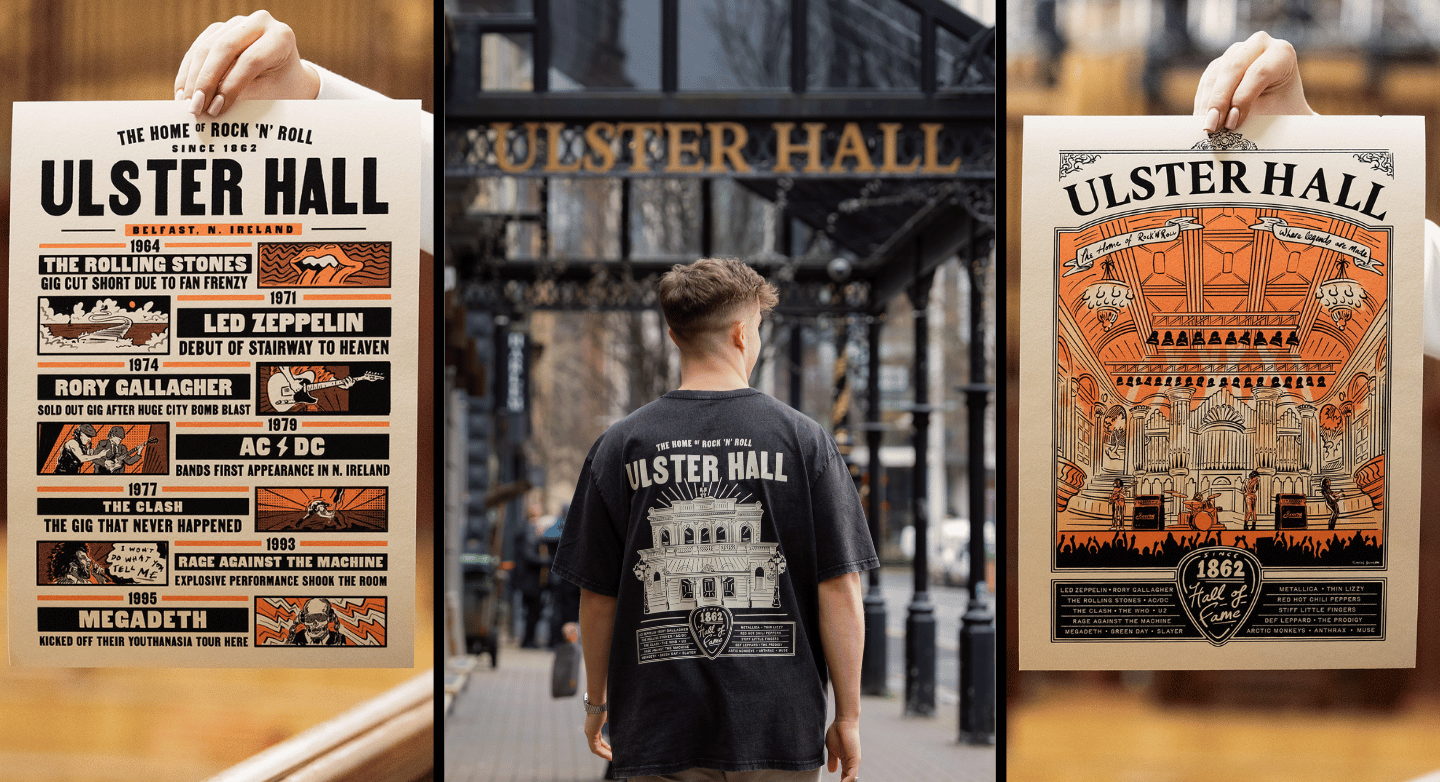 Belfast illustrator Thomas Bannon was commissioned to create bespoke artwork for the bags, featuring the Ulster Hall’s familiar Victorian façade. It was designed by architect William Joseph Barre, who also designed the Albert Clock in the city, and opened in 1862.
